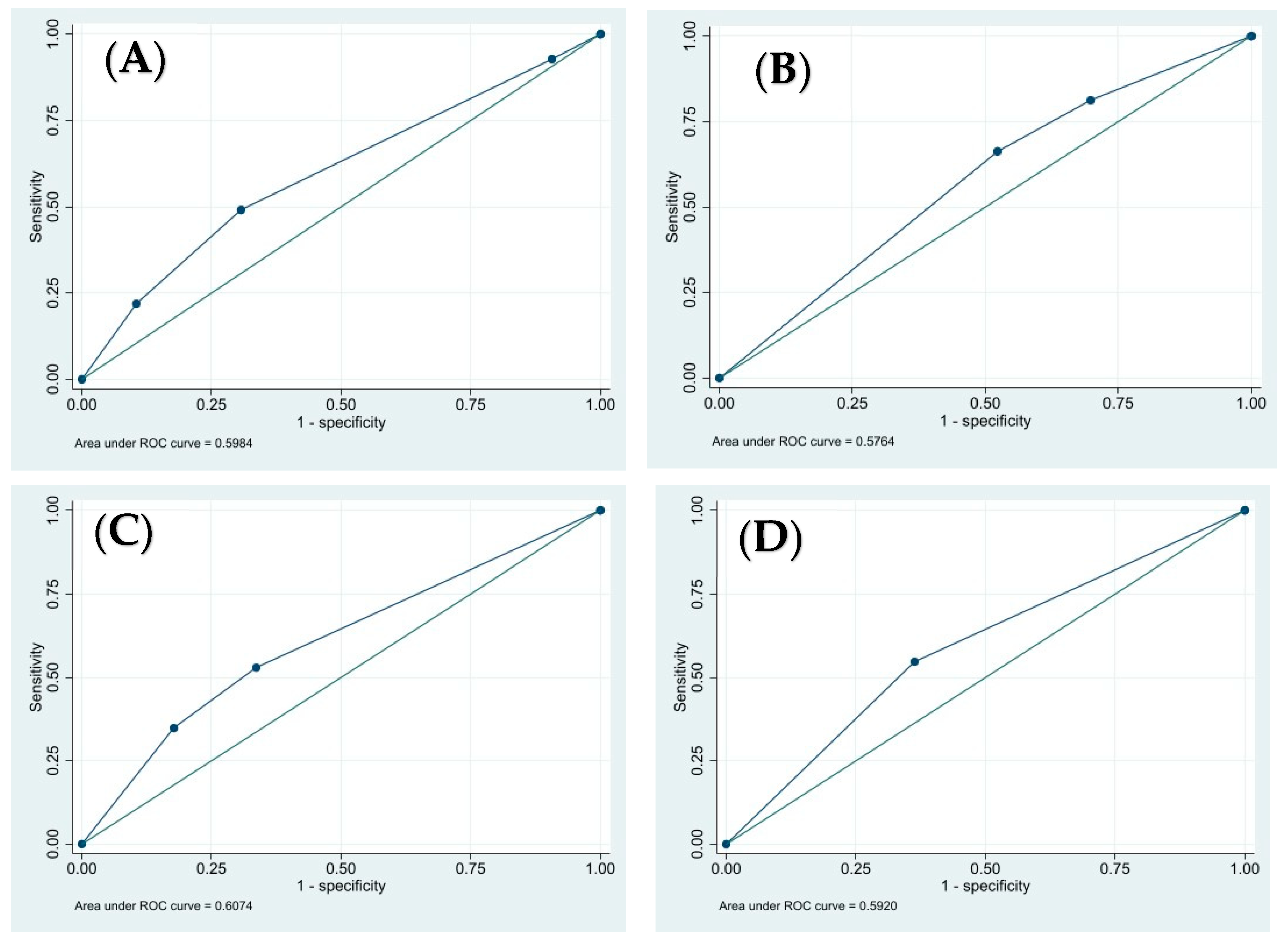 3.4. Receiver Operator Curve Analysis of Body Mapping Indicators as a Predictor of Having at Least One Measured NCD; Hypertension, Diabetes, Dyslipidemia, or Self-Reported Myocardial Infarction or Stroke