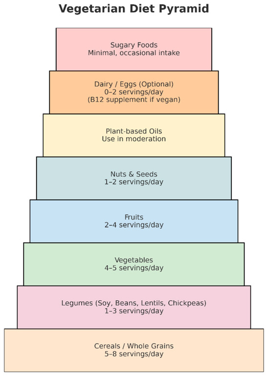 The diet was cholesterol-free and rich in vitamins (beta-carotene, folic acid, B1, B3, B6, C, E), minerals (Mg, Fe, K, Se), and phytochemicals. It was created based on the vegetarian diet pyramid, as elaborated by Dr. Ella Haddad from the University of Medicine of Loma Linda (2008 version) (Figure 1) [13].