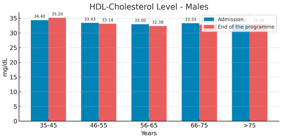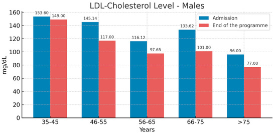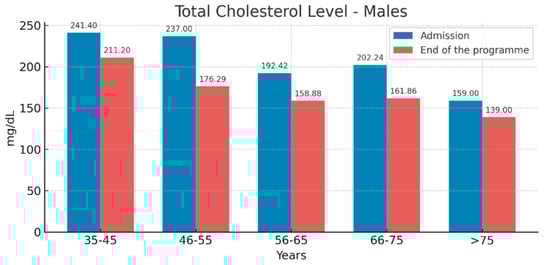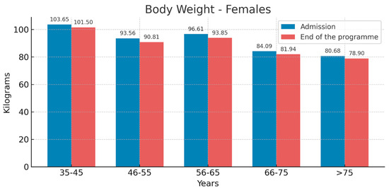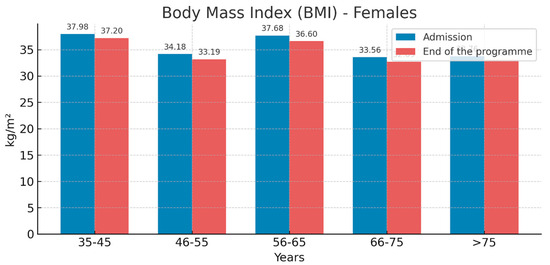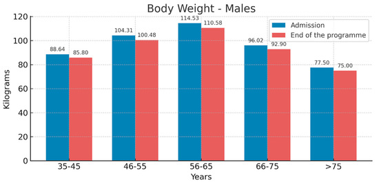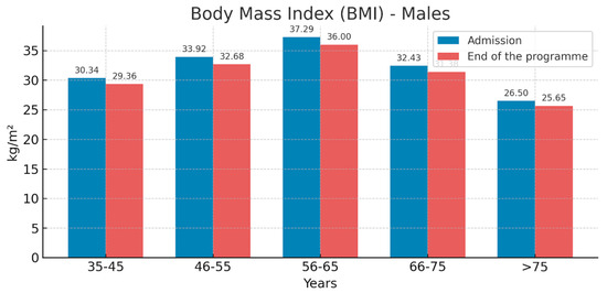 On the first day of admission, 119 patients registered a BMI of 30 kg/m2, while at the end of the program, only eight patients managed to lower their BMI. The best results were observed in individuals aged 56–65 years, where the average BMI decreased by 1.29 kg/m2 in males and by 1.08 kg/m2 in females (Figure 14 and Figure 15).