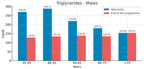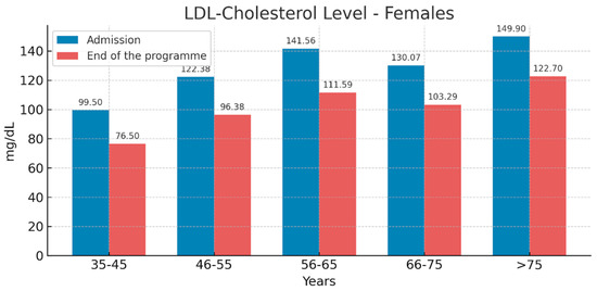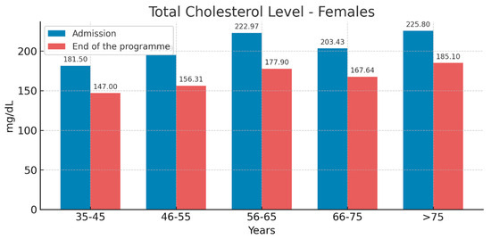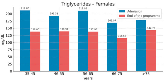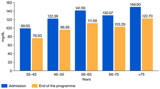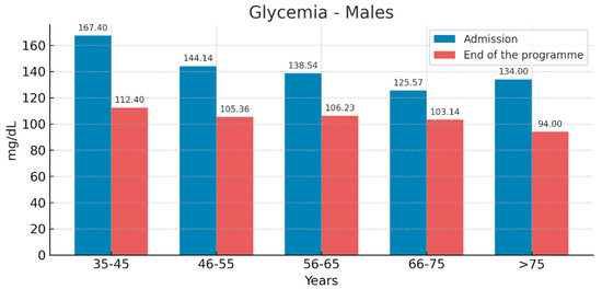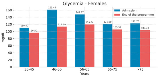 In females, glycemia levels decreased on average by 25.5 mg/dL, but the best results were observed in females aged between 46 and 55 years, in whom the average value decreased by 47.75 mg/dL (29%) after the 10-day program (Figure 11).