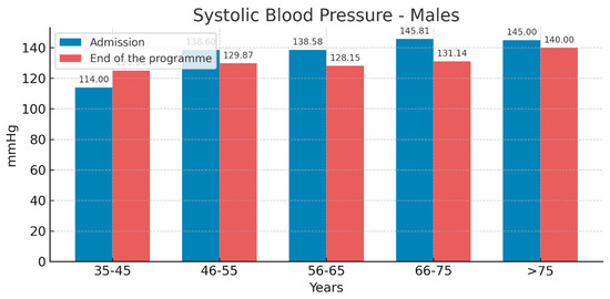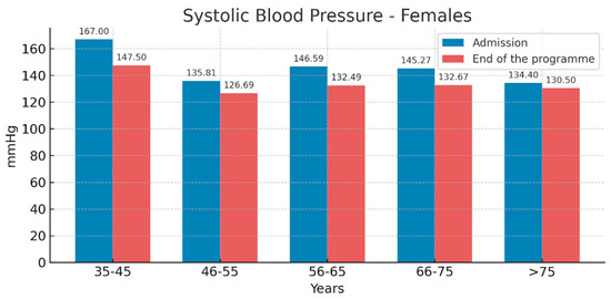 After 10 days of lifestyle changes, systolic blood pressure decreased by 5.57 mmHg in males, while in females, systolic blood pressure decreased by an average of 11.84 mmHg, which is twice that in males. The best results were observed in males aged between 66 and 75 years, in whom systolic blood pressure decreased by 14.67 mmHg (Figure 16), and in females aged 35–45 years, of whom systolic blood pressure decreased by 19.5 mmHg (Figure 17).