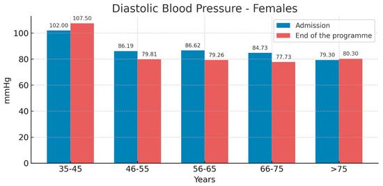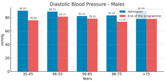 After 10 days of lifestyle changes, diastolic blood pressure decreased on average by 9.39 mmHg in males, while females registered a slight decrease, averaging 2.85 mmHg. The best results were observed in males aged between 35 and 45 years, whose diastolic blood pressure decreased by 14.2 mmHg (with 15% from the initial measurement) (Figure 18), and in females aged between 56 and 65 years, whose diastolic blood pressure decreased by 7.36 mmHg (Figure 19).
