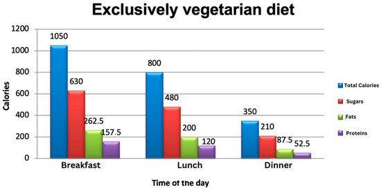 The vegetarian diet pyramid includes the main food groups: those at the top are necessary in small quantities, while at the base, the most important foods, such as those for nutritional intake, are necessary in larger amounts [13]. As a result, in designing the daily menu, we considered these nutritional groups, but with fewer portions from each category.