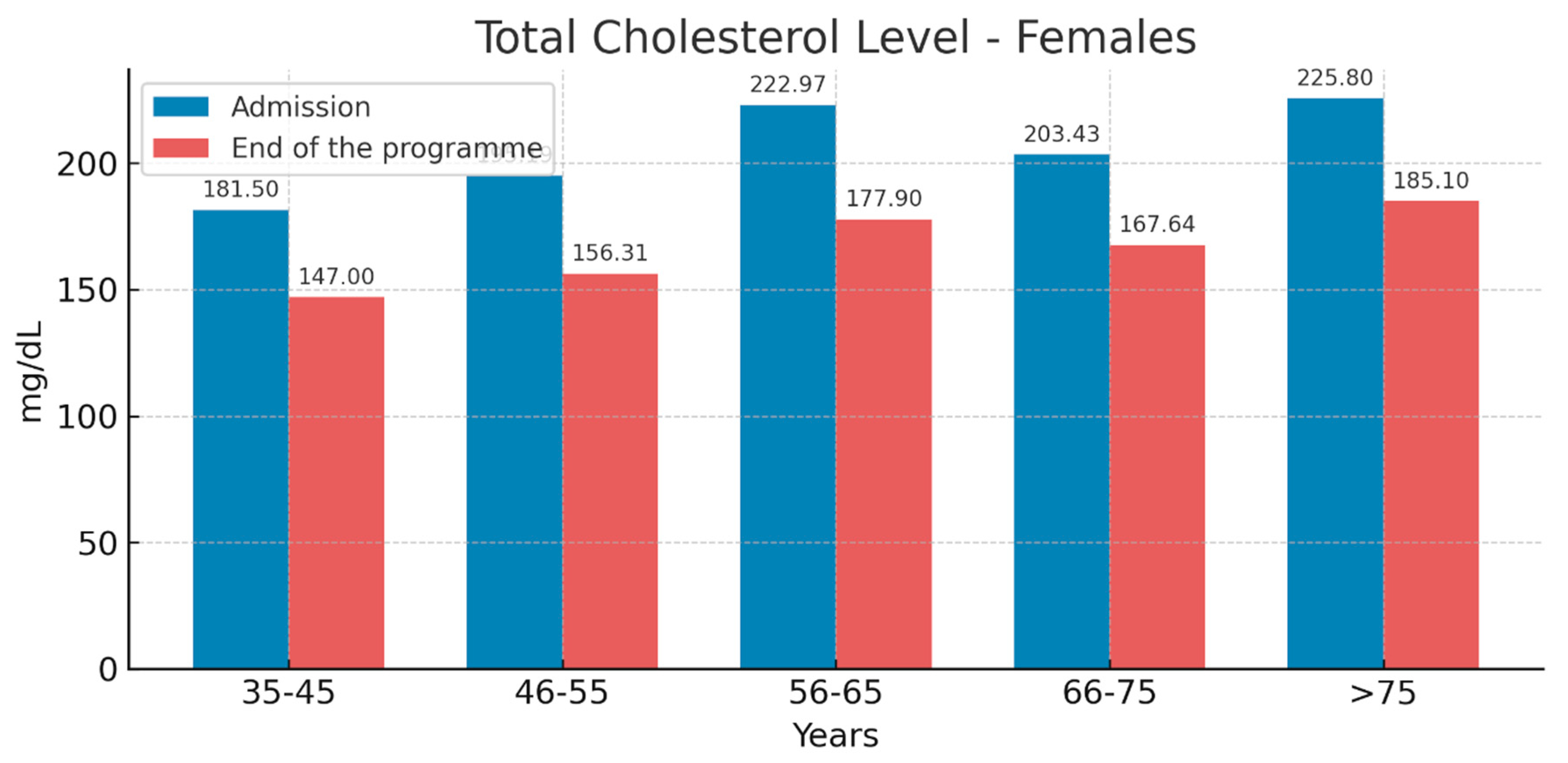 - Total serum cholesterol decreased on average by 41.21 mg/dL, with 19.54% less than the value registered on admission;