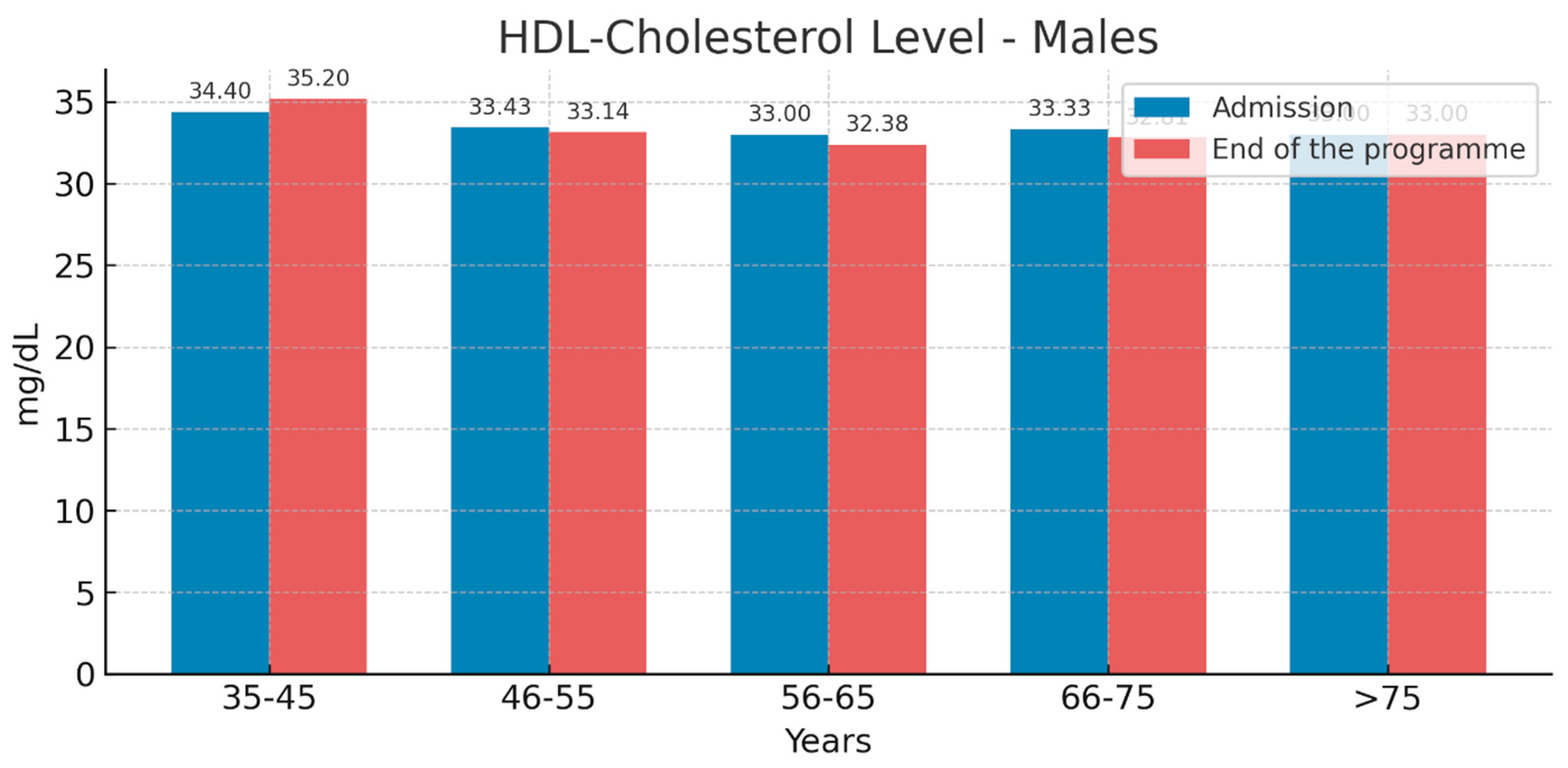 - LDL cholesterol decreased on average by 26.24 mg/dl, with 19.71% less than the value registered on admission;