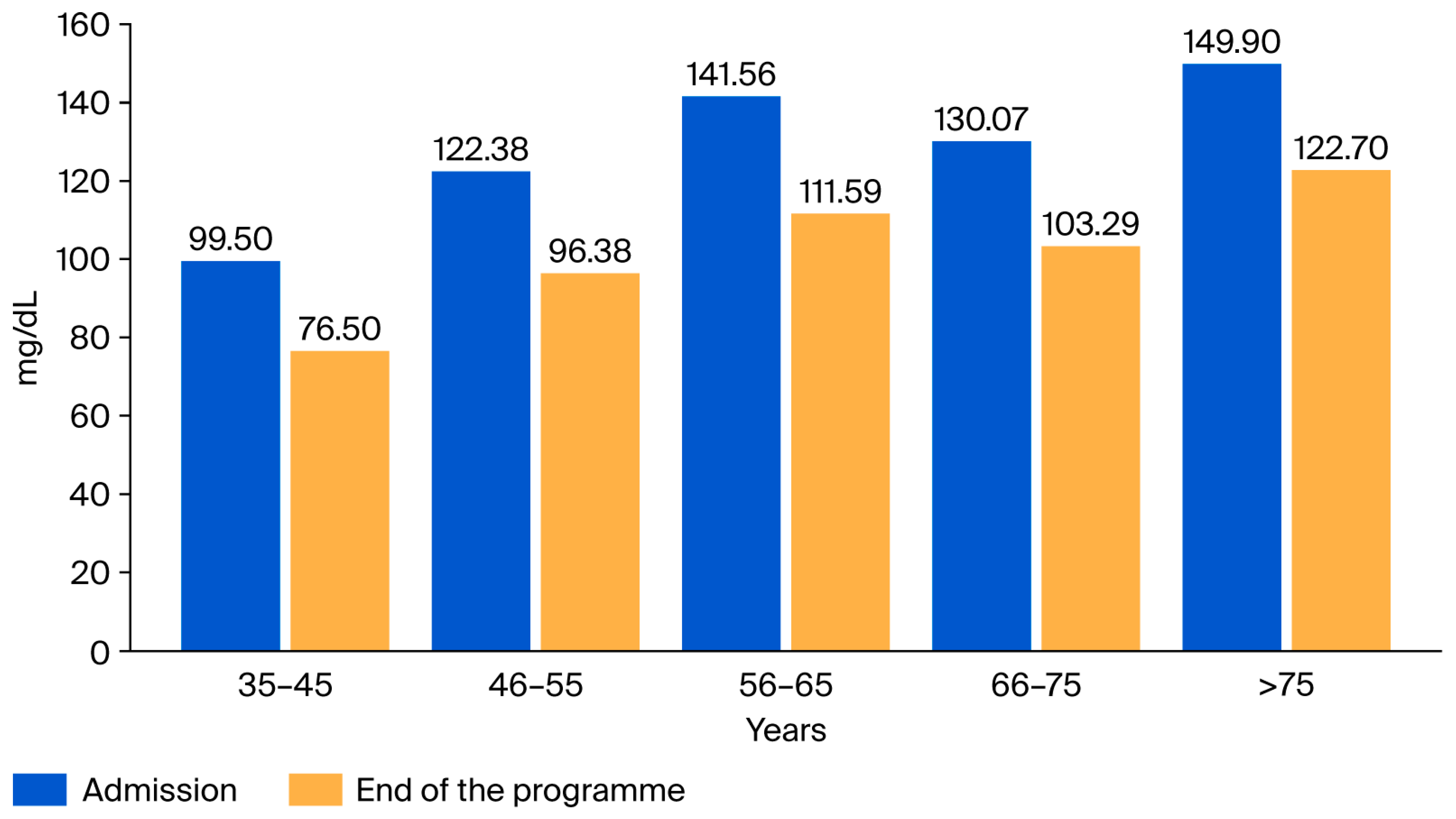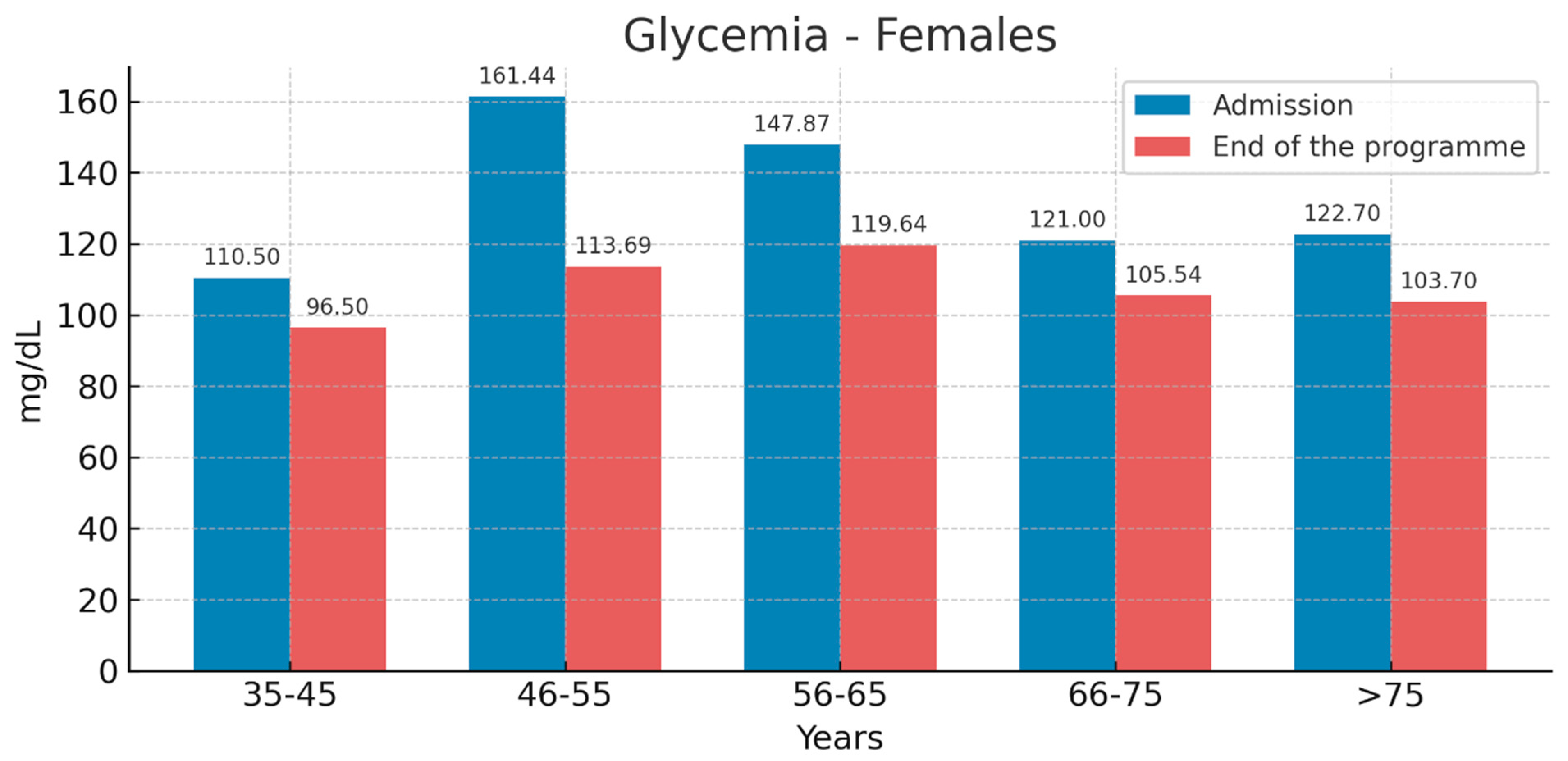 - Glycemia decreased on average by 30.4 mg/dL, with 21.61% less than the value registered on admission;