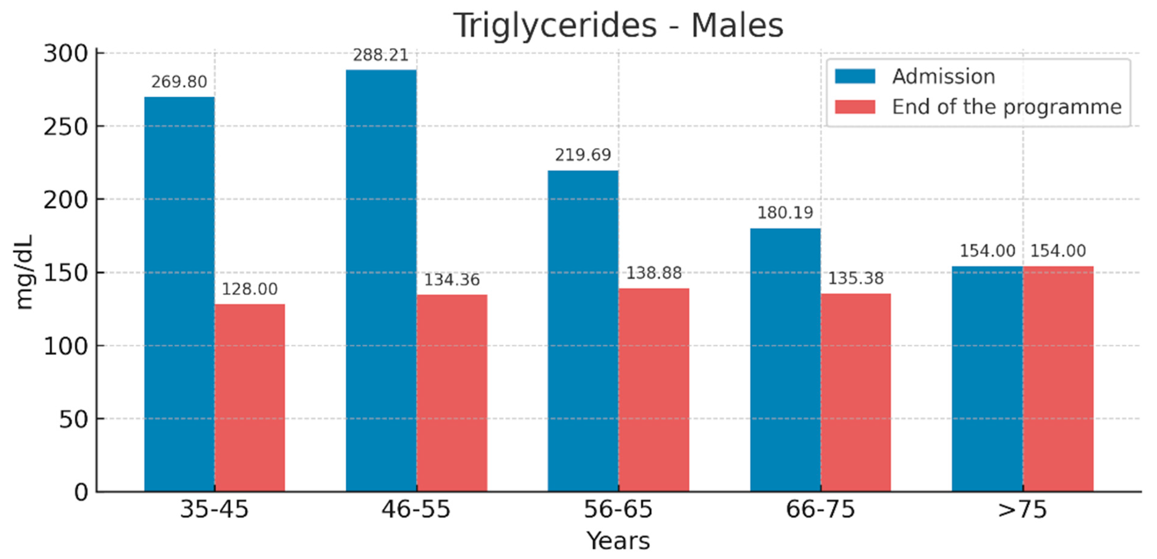 - Serum triglycerides decreased on average by 72.86 mg/dL, with 34.9% less than the value registered on admission;