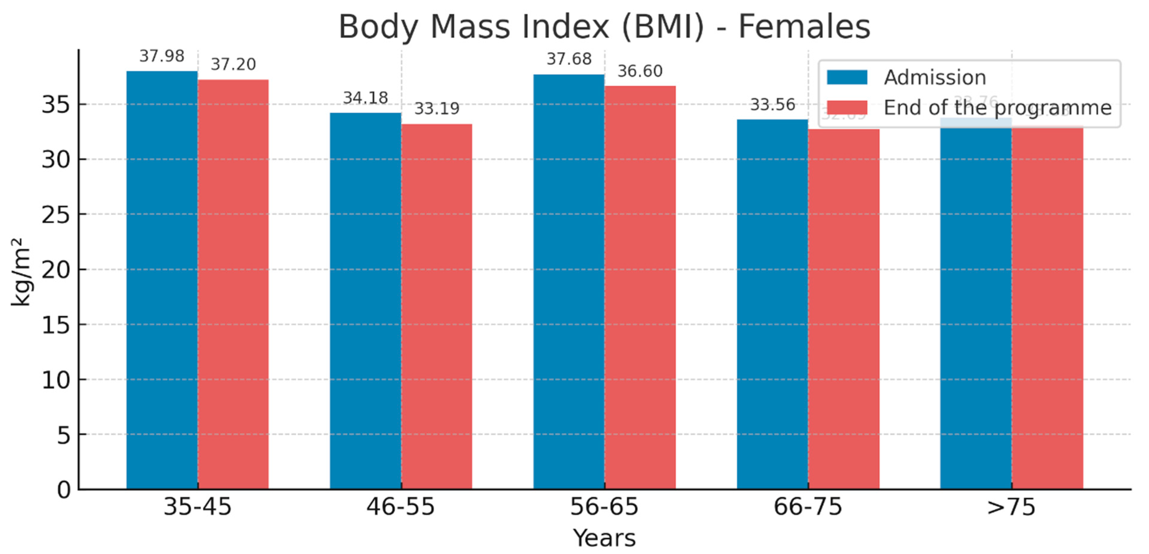 - Body weight decreased on average by 2.99 kg, resulting in a 3% BMI reduction from the initial value registered on admission;