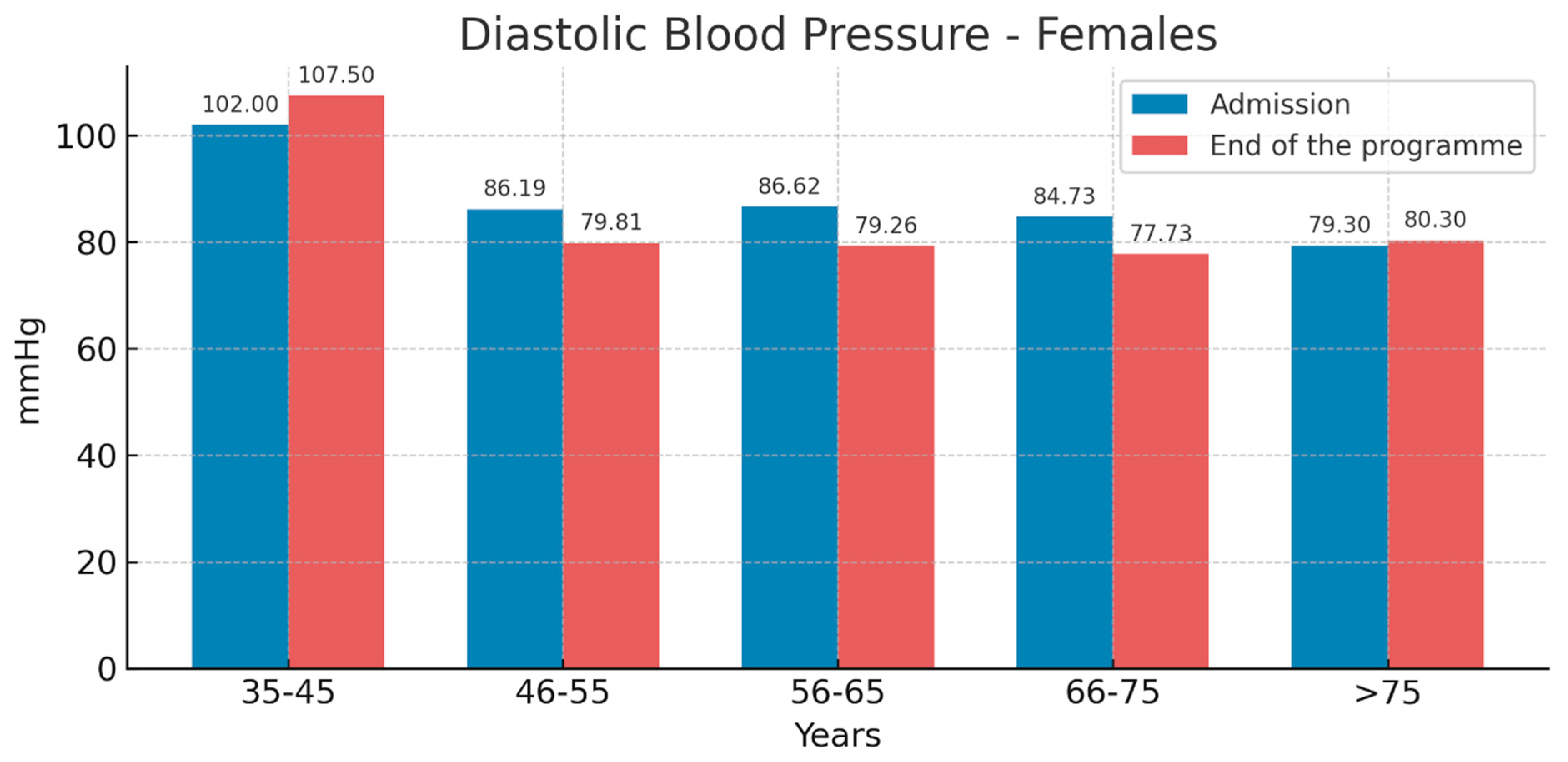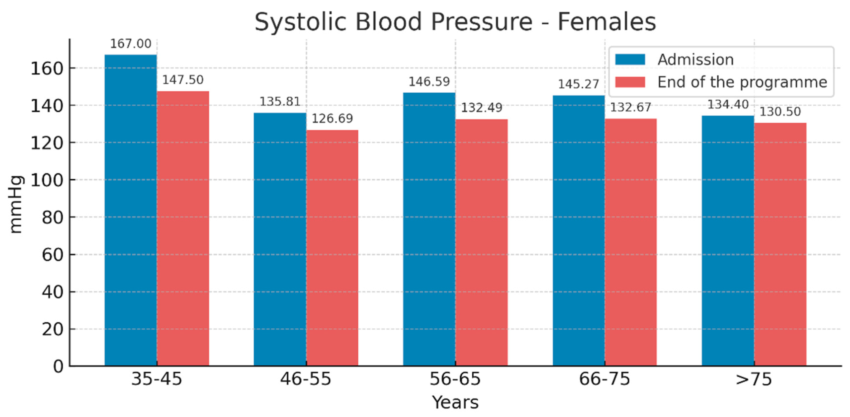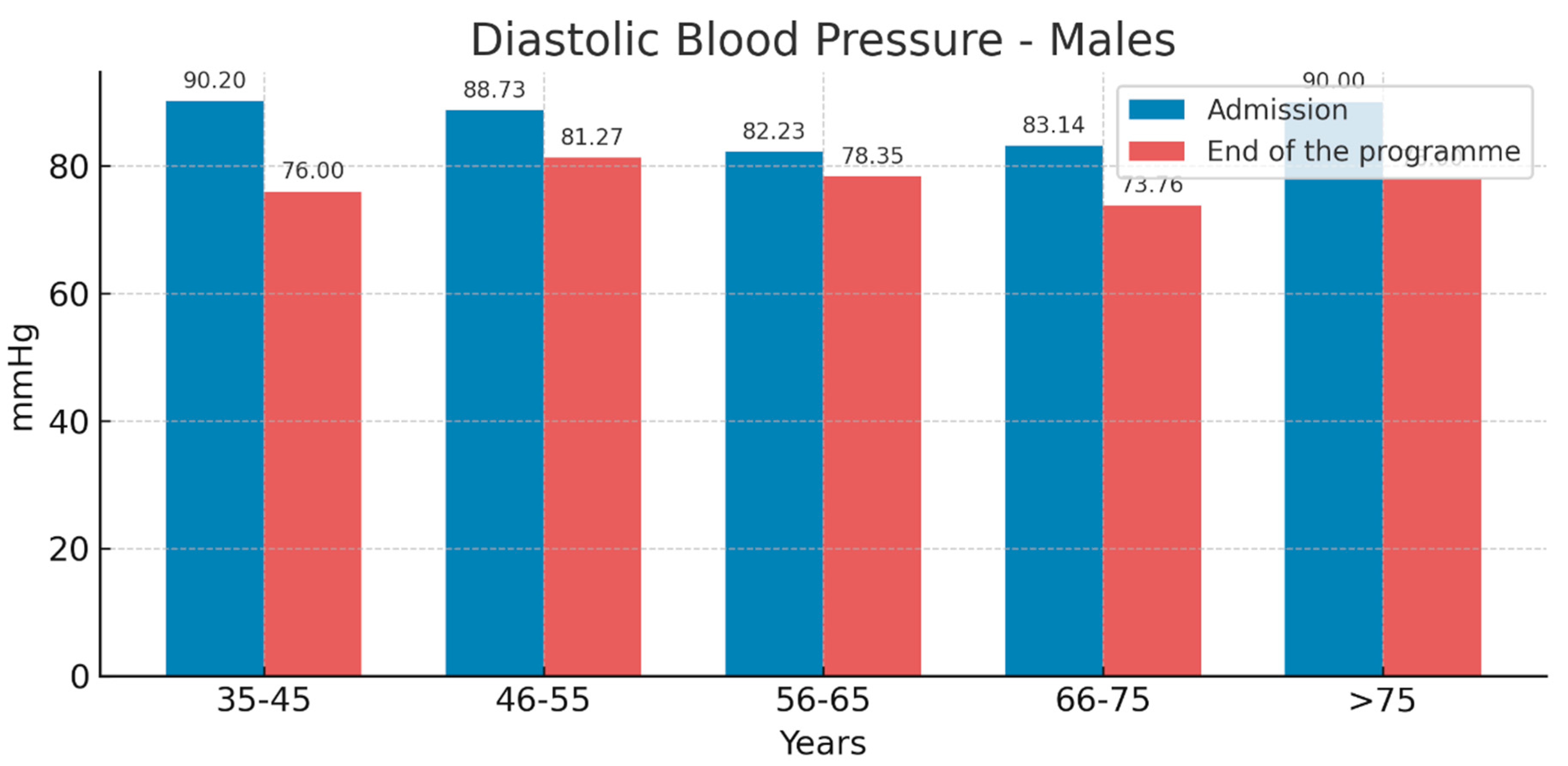 - Systolic blood pressure decreased on average by 10.82 mmHg, but the diastolic blood pressure decreased by 6.44 mmHg, meaning a 7.6% reduction in blood pressure from the initial value registered on admission.