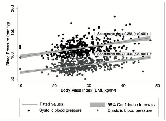 When evaluating the distribution of systolic blood pressure (SBP) and diastolic blood pressure (DBP) according to body mass index (BMI) in this population, both measures of blood pressure increased proportionally with higher BMI. Notably, DBP appeared to be more strongly influenced by BMI than SBP. A study conducted in Presidente Prudente, São Paulo, similarly identified a relationship between BMI, SBP, and DBP, showing that higher BMI values were associated with higher blood pressure levels. Consistent with the present findings, that study used Pearson’s correlation coefficient and demonstrated that DBP was more strongly correlated with BMI (r = 0.226) than SBP (r = 0.205) []. Comparable results were observed in a study of 123 women aged 18–50 years in India, where the correlation coefficients for DBP and SBP with BMI were 0.35 and 0.30, respectively []. Conversely, other studies have reported different patterns. For instance, research conducted in Vitória, Espírito Santo, found that SBP was more strongly associated with BMI than DBP []. Similarly, a cross-sectional study in Aracaju, Sergipe, observed a stronger correlation between BMI and SBP compared to DBP [].