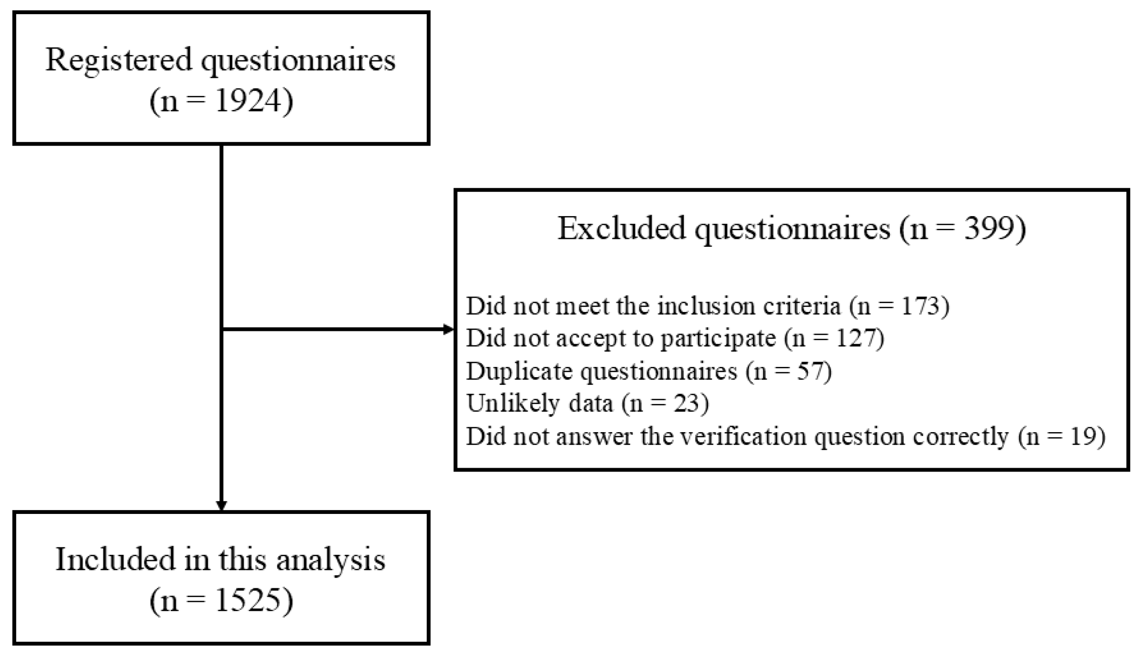 A total of 1924 questionnaires were registered on the online platform. Of these, 399 were excluded, and the participant inclusion flowchart is presented in Figure 1. Therefore, 1525 participants were included in this study.