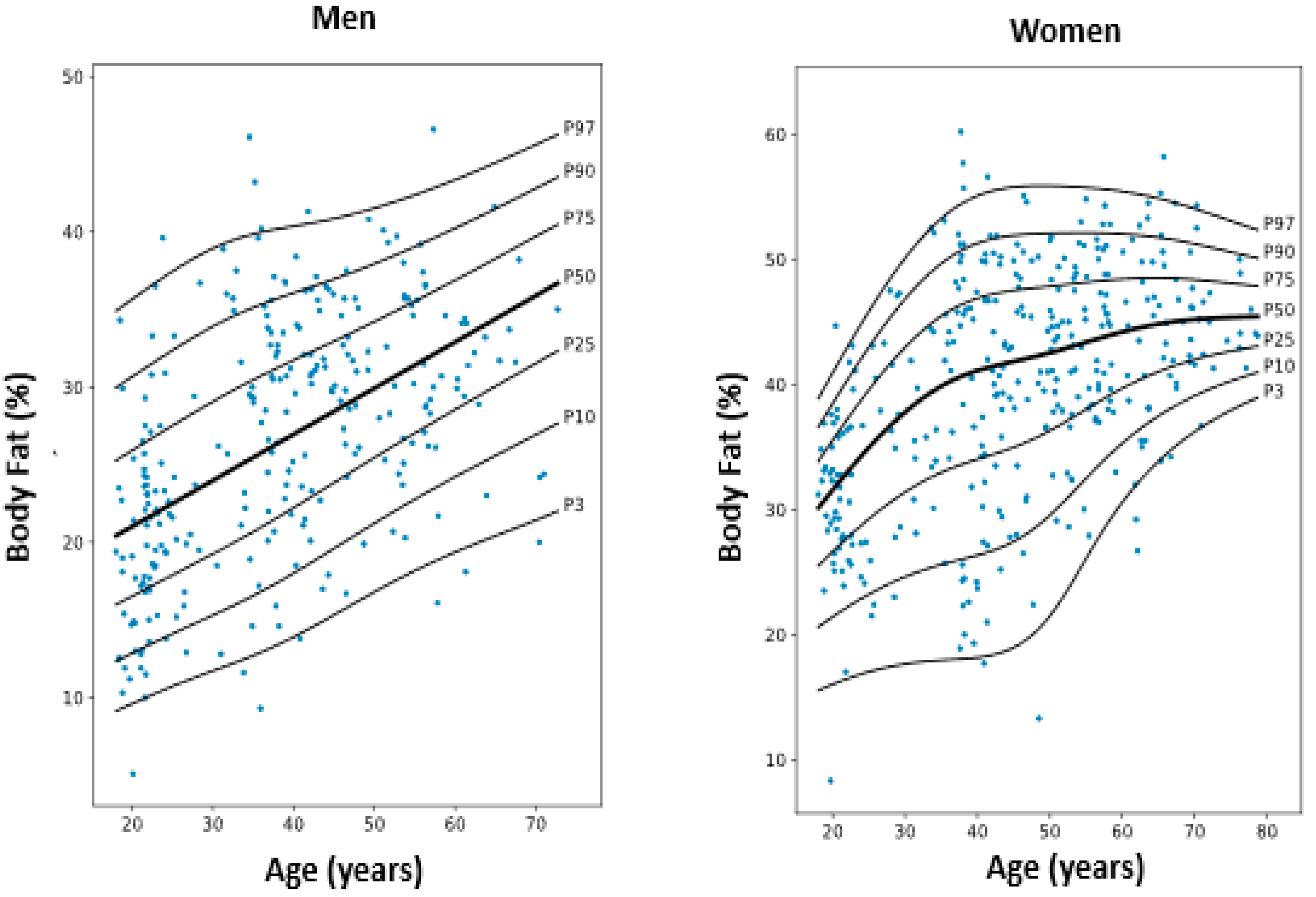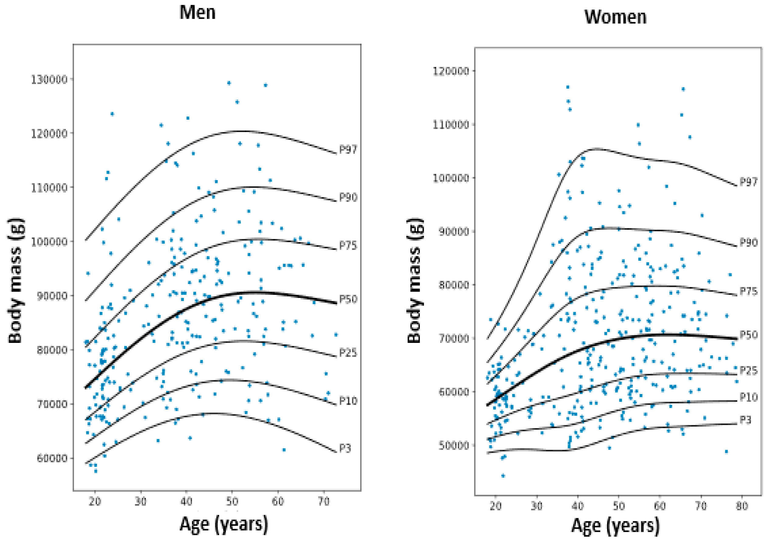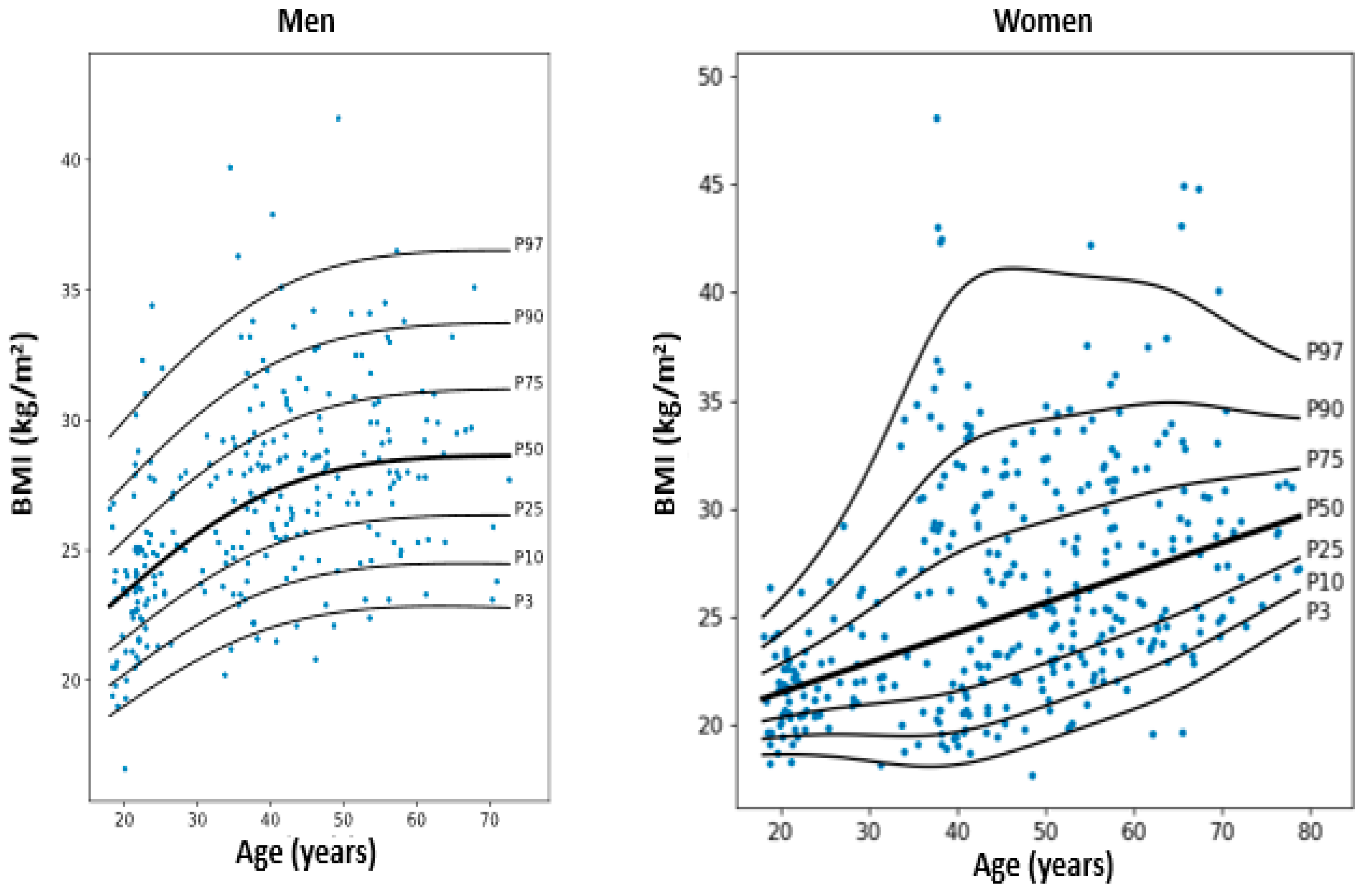 - Larsson, I.; Lissner, L.; Samuelson, G.; Fors, H.; Lantz, H.; Näslund, I.; Carlsson, L.M.S.; Sjöström, L.; Bosaeus, I. Body Composition through Adult Life: Swedish Reference Data on Body Composition. Eur. J. Clin. Nutr. 2015, 69, 837–842. [Google Scholar] [CrossRef] [PubMed]