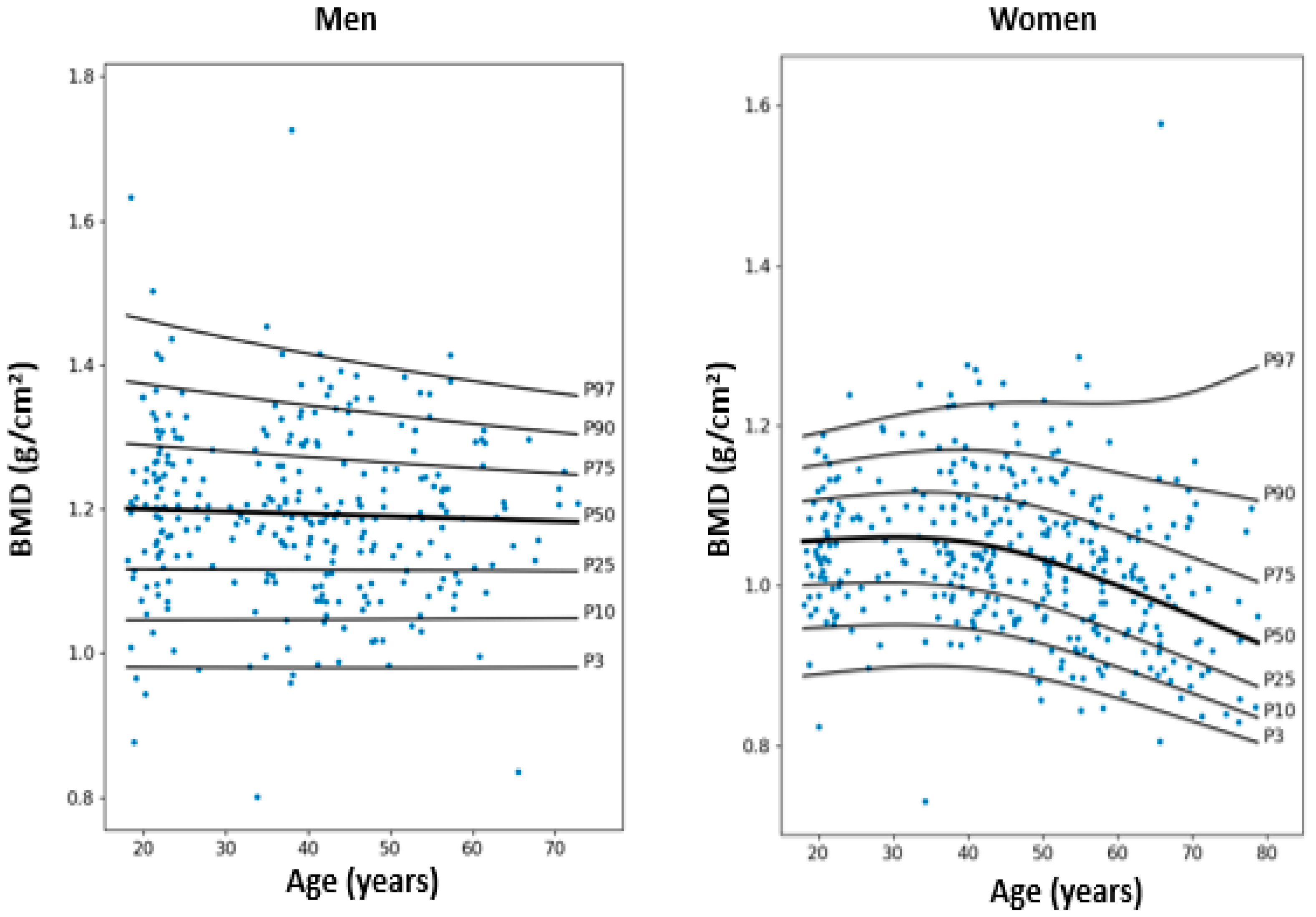 - Krassas, G.E.; Papadopoulou, F.G.; Doukidis, D.; Konstantinidis, T.; Kalothetou, K. Age-Related Changes in Bone Density among Healthy Greek Males. J. Endocrinol. Investig. 2001, 24, 326–333. [Google Scholar] [CrossRef]