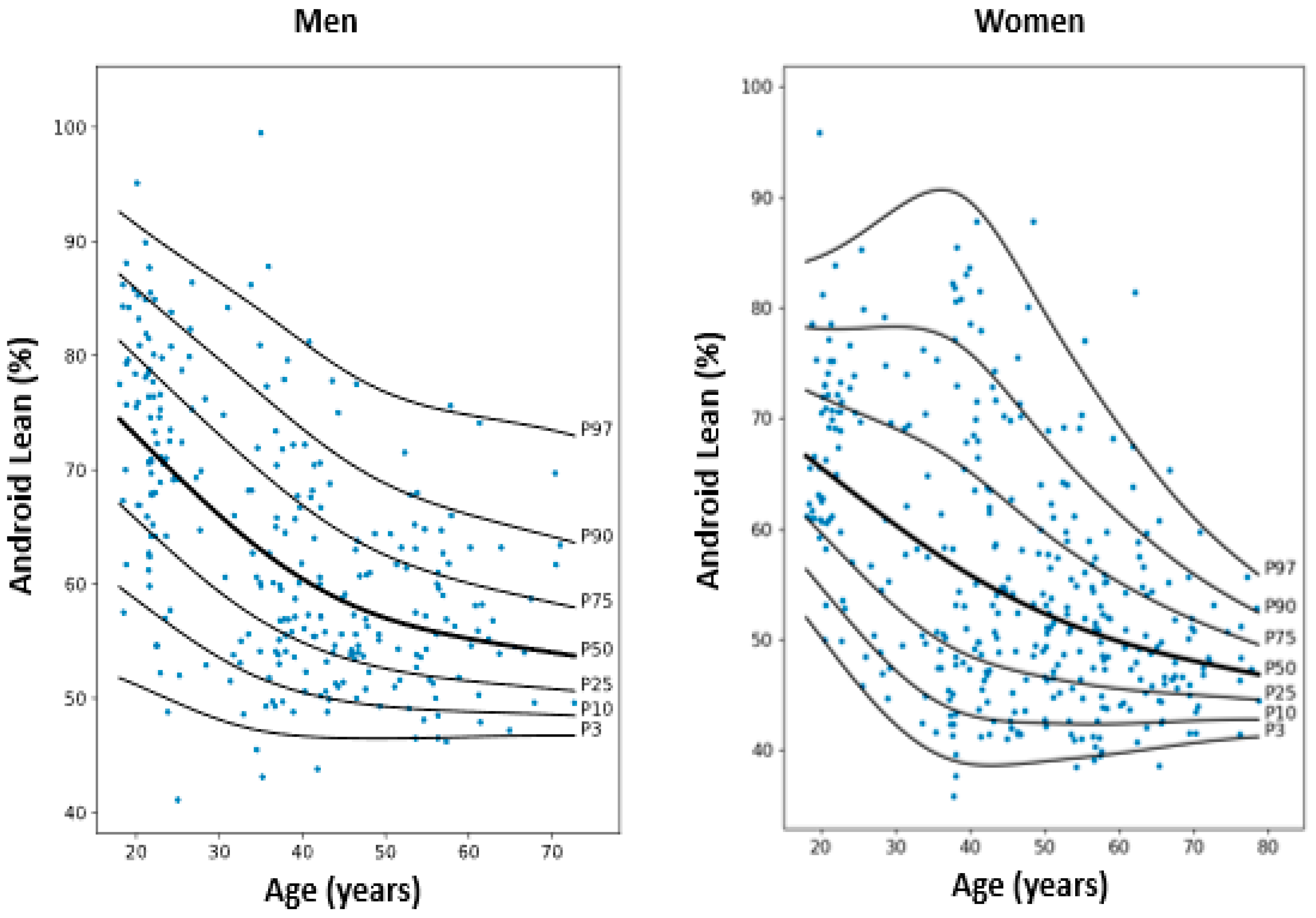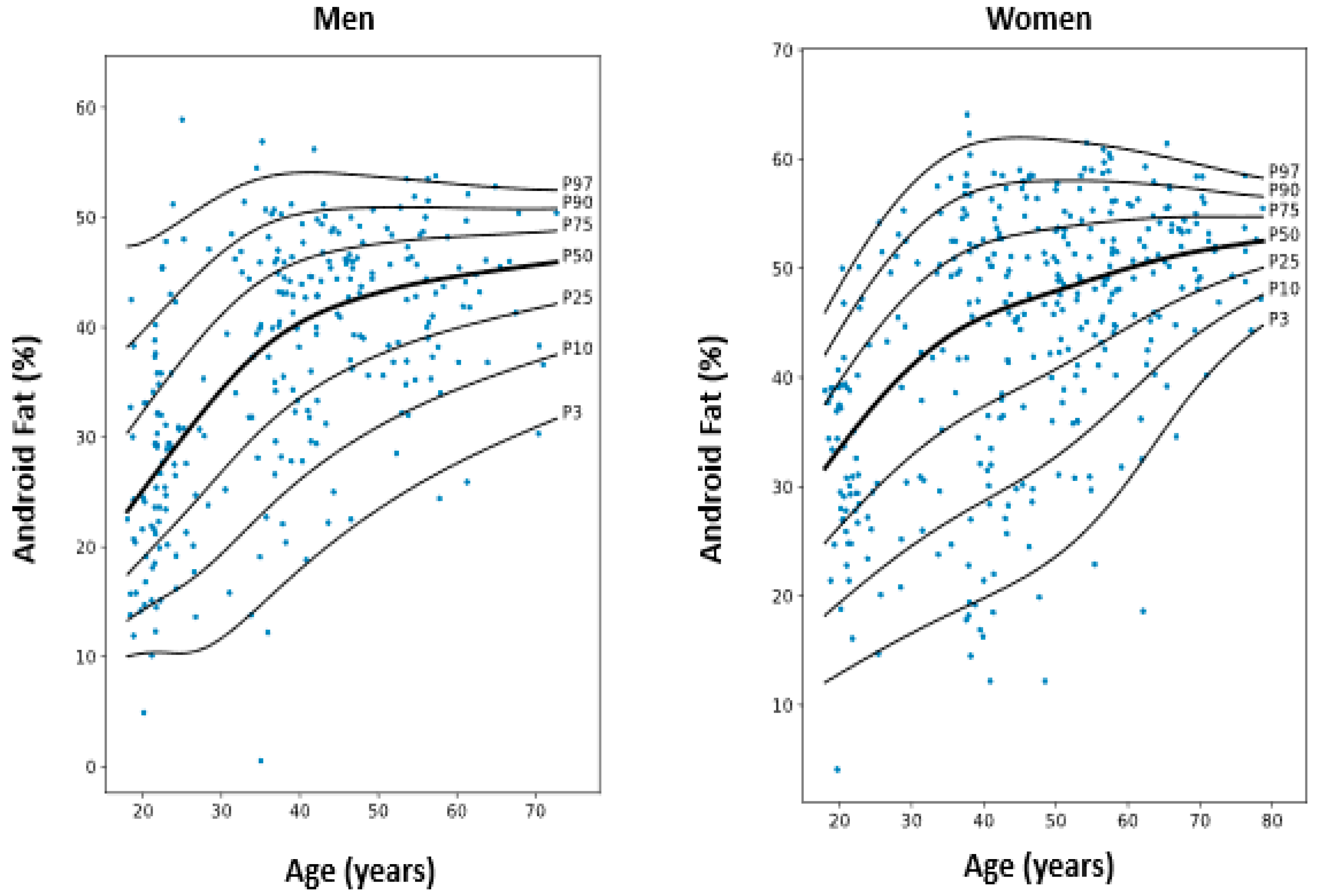 - Mastaglia, S.R.; Solis, F.; Bagur, A.; Mautalen, C.; Oliveri, B. Increase in Android Fat Mass with Age in Healthy Women with Normal Body Mass Index. J. Clin. Densitom. 2012, 15, 159–164. [Google Scholar] [CrossRef] [PubMed]