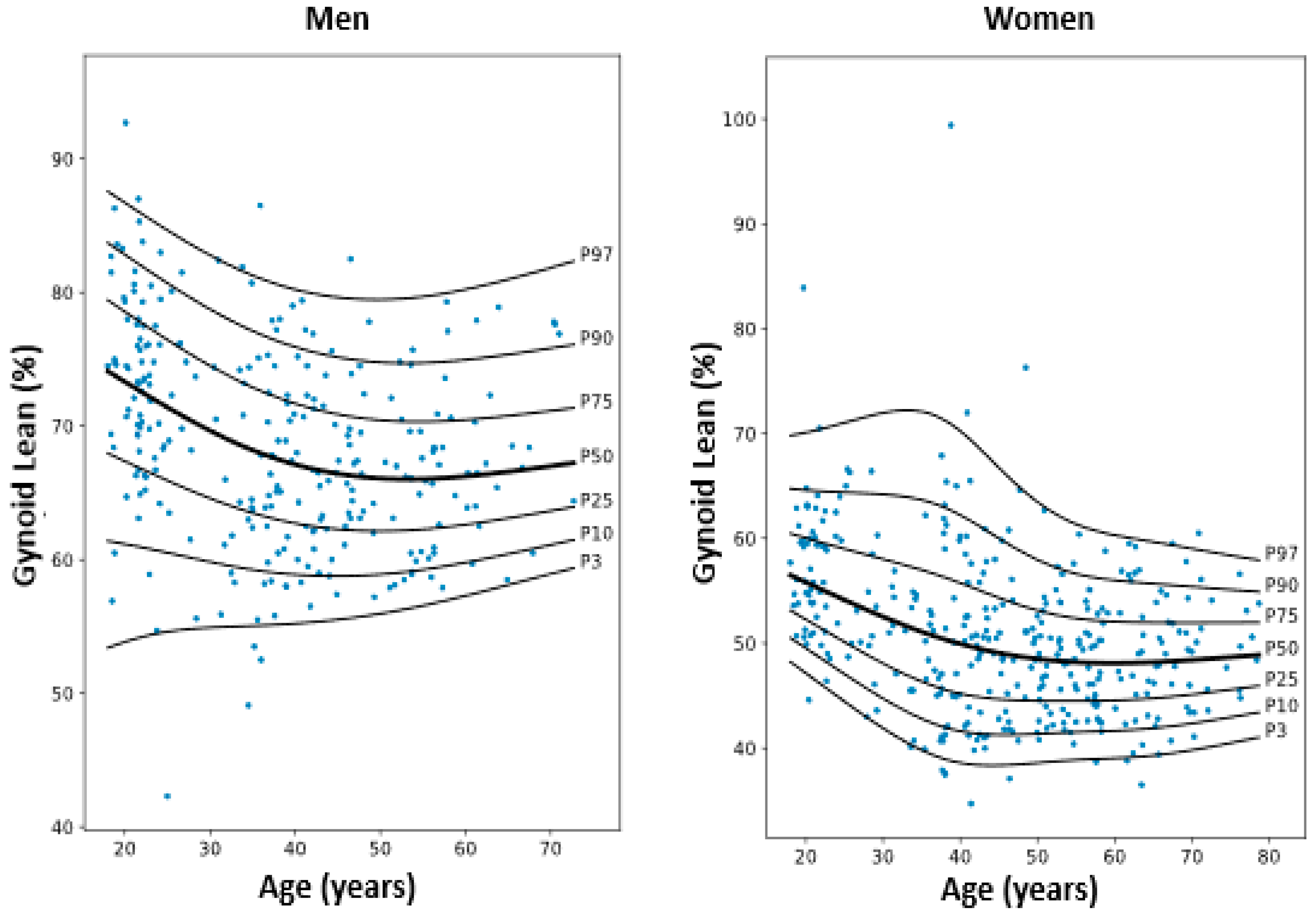 - Xiao, Z.; Guo, B.; Gong, J.; Tang, Y.; Shang, J.; Cheng, Y.; Xu, H. Sex- and Age-Specific Percentiles of Body Composition Indices for Chinese Adults Using Dual-Energy X-Ray Absorptiometry. Eur. J. Nutr. 2017, 56, 2393–2406. [Google Scholar] [CrossRef] [PubMed]