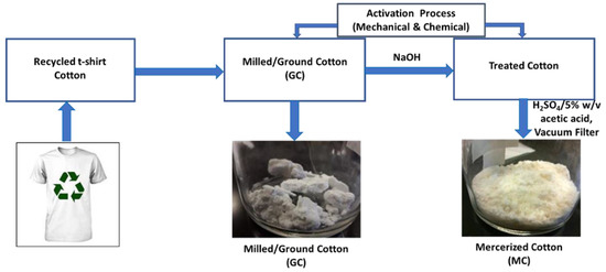 Flow chart of the mechanical and chemical activation of cellulose pulp from cotton t-shirts.