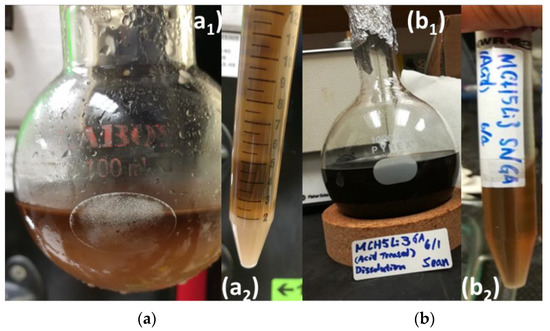 About 3 wt.% (weight percentage) of activated cellulose pulp was dissolved in LiCl/DMAc (at 8% w/v LiCl) in a 100 mL round-bottom flask. Spinning dopes of dissolved cellulose were heated to 127 °C (±3 °C) with stirring at 250 rpm. The dissolution of cellulose pulp was complete among dopes that were quenched to room temperature with tap water under vigorous shaking (as shown in the centrifuged sample of Figure 2b). In contrast, undissolved cellulose was observed among the dopes that were gradually cooled to room temperature while under stirring (Figure 2a). GA induced spinning dopes were obtained as similar procedure where GA was added during cellulose dissolution. From our previous study on cellulose acetate (CA) and GA antiplasticization [21], an optimal ratio of ~100:2 (w/w) between CA and GA was found, respectively. This weight ratio was converted to moles of hydroxyl groups (to normalize for hydrogen bonding) to get a 7:1 (mol -OH/mol -OH) between CA and GA, respectively. This hydroxyl molar ratio was used to calculate the mass of GA required for cellulose which was calculated to be ~10 wt%. Spinning dopes of 10 wt.% GA and GC neutralized with strong and weak acids were termed GA/GCS and GA/GCW, respectively.