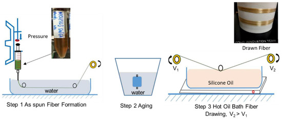 The wet spinning of RC is illustrated within the three steps of Figure 3. Step 1 involves the loading of spinning dope (20 mL) into a high-pressure steel syringe and the extrusion of fiber through a 22-gauge (0.43 mm inner diameter) syringe needle. Solvent extraction from as-spun fiber occurred in the aqueous coagulation bath at room temperature. Afterwards, as-spun fibers of RC were collected onto a rotating winder. In step 2, as-spun fiber was soaked in tap water for ~18 h at room temperature to further aid solvent removal. Step 3 of Figure 3 involved the batch drawing of aged, as-spun fiber from step 2 through two stages of silicon oil drawing. Each stage of thermal drawing occurred at consecutively higher temperatures. The draw ratio (DR) for each stage of as-spun fiber or thermal drawing was calculated by Equation (1); wherein, V1 and V2 represent the linear velocities of feed and take-up winders, respectively.