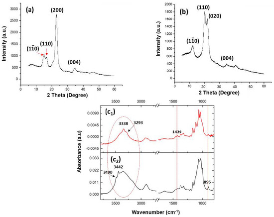 The chemical activation of cellulose pulp involves NaOH mercerization and acid neutralization. In the case of Figure 4, mercerized pulp was neutralized with the strong acid H2SO4. Differences between the semicrystalline microstructures of strong acid neutralized pulp and untreated GC are shown among the diffractograms of Figure 4a,b. GC features the cellulose-I crystal form. Three diffraction peaks near 2θ values of 14.8°, 16.4°, and 22.6° are associated with the crystallographic planes of (10), (110), and (200), respectively, which are structurally characteristic of cellulose I (French, 2014). The acid neutralized pulp of GCS represents the transition from cellulose I to cellulose II. This transformation from native cellulose to a lower degree of crystallinity is evidenced by peak shifting to a higher wavenumber (3338 to 3442 cm−1) and the broadening of peaks (Figure 4c) [23,24]. Apart from the -OH vibration range (3000–3700 cm−1), a prominent peak was observed at 1429 cm−1 in cellulose I (Figure 4c1) which disappeared in cellulose II after washing (Figure 4c2) [23]. These changes in cellulose spectra were caused by the removal of the alkali and conformational changes in pulp as cellulose II formed [25]. Cellulose-I exhibits the parallel packing of hydroxymethyl groups (-CH2OH) between adjacent chains of cellulose (Figure 5).