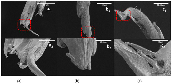 Fiber fracture tips of (a) neat GCS, (b) GA/GCW, and (c) GA/GCS were imaged using SEM at (1) low and (2) high resolution.
