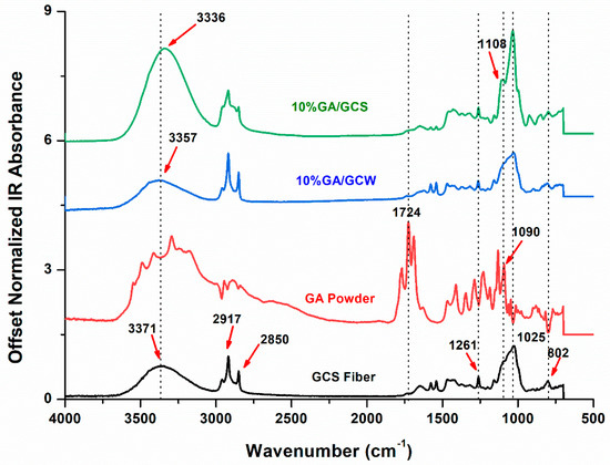 The peak intensities for -OH groups (3000–3700 cm−1) were found significantly higher and narrower for GA/GCS fibers (Figure 8); these represent the mildest instances of alkaline hydrolysis and dehydration [42]. The new peak observed at 1108 cm−1 (C=O) shoulder of C-O-C peak at 1025 cm−1 among fully drawn GA/GCS fiber. The added GA molecules can reside in amorphous polymer chains and interact with them. The high temperature drawing of fibers under tension influences GA co-crystallization and strain hardening among the GA-modified fibers. Further, GA/GCS was the strongest of the GA-modified RC fibers.