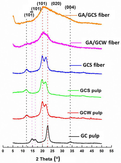X-ray diffraction patterns for these samples are given: GC, GCW, and GCS pulp; GCS fiber; GA/GCW and GA/GCS fibers.