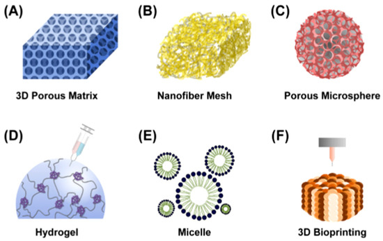 Different types of polymeric scaffolds for tissue engineering: (A) 3D porous matrix, (B) nanofibrous mesh, (C) porous microsphere, (D) hydrogel, (E) micelle and (F) 3D bioprinting [7].