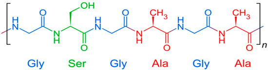Silk fibroin, prepared from silkworms (mulberry silkworm of the Bombyx mori), has become a widely used biomaterial due to its unique physicomechanical and especially strength properties and high elasticity, biocompatibility, well-studied surface chemistry, controlled degradation, water and oxygen permeability, renewable reserves, low cost and ease of processing. The amino acid composition of B. Mori silk fibroin, purified from sericin, consists mainly of glycine (Gly) (43%), alanine (Ala) (30%) and serine (12%) and a small number of other amino acids [78]. A simplified fibroin formula is shown in Figure 3.