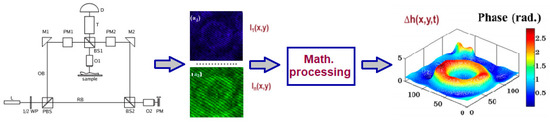 One of the most modern, reliable and super-resolving methods that is used for applied and fundamental problems of biomedical research, which makes it possible to quickly assess the morphofunctionality of biopolymer coatings, is interference microscopy [99,100]. At the heart of the modern optical method of modulation laser interference microscopy, the local phases of the modulated object of the light wave are measured and taken into account with full control of the polarization of the region, and the obtained interferograms provided on the photodetector after mathematical processing restore the phase portrait of the portrait field of view (Figure 5) [101,102].