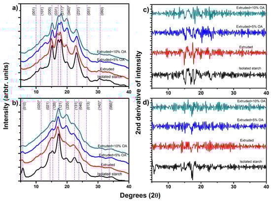 As shown in Figure 2a,b, both isolated and extruded starches had a similar diffractogram with slight reductions in the relative intensity. Contrary, extruded starches with oleic acid showed an increase in certain Bragg’s angles, which does not correspond to the isolated X-ray patterns.