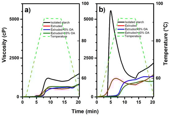Figure 3 shows the viscosity profile of isolated, extruded, and extruded starches with 5% and 10% of oleic acid. Figure 1a,b shows the viscosity profile of rice and potato starch treatments, respectively. The extrusion process showed a significant effect (p < 0.05) on the viscosity profile, regardless of the source. In that sense, in rice extrudates, the maximum viscosity was reduced from 1523 ± 26 cP (isolated) to 850 ± 15 cP (extruded) (Figure 3a). The same reduction was observed regarding the potato starch treatments (Figure 3b), starting from 5499 ± 78 cP in isolated and decreasing to 1425 ± 24 cP when extruded. The above may result from heat treatment and mechanical work (shearing) that the starch granules were subjected to during extrusion, which damaged their structural integrity, causing the disruption of inter and intramolecular hydrogen bonds, hindering their ability to absorb water and gelling [21]. Consequently, low viscosities at the maximum peak are a characteristic of extruded starches, corresponding to the results obtained, where it seems that partial hydrolysis of the granules has occurred (as observed in Figure 1 and Figure 2 and Table 2).