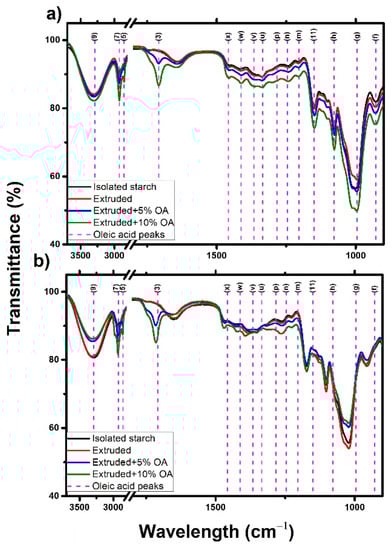 Infrared spectra of isolated, extruded, and extruded starches with 5% and 10% of oleic acid. (a) rice starch + oleic acid; (b) potato starch + oleic acid. OA: oleic acid.