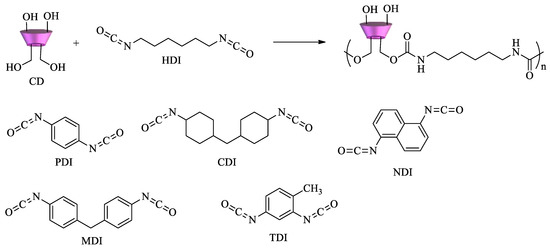 However, EPI is not the only crosslinker used to polymerize cyclodextrins. Diisocyanates can react with CDs to form polyurethanes (Scheme 2). Depending on the structure and the relative molar ratio of the diisocyanate, materials with different surface areas, pore size distribution, mechanical properties, and sorption ability can be obtained. Various diisocyanates can be used as crosslinking agents, namely, 1,6-hexamethylene diisocyanate (HDI), 2,4-toluene diisocyanate (TDI), 1,4-phenylene diisocyanate (PDI), 4,4′-dicyclohexylmethane diisocyanate (CDI), 4,4′-diphenylmethane diisocyanate (MDI), and 1,5-naphtalene diisocyanate (NDI), as shown in Scheme 2 [69,70].