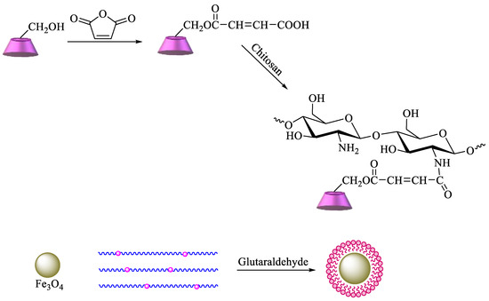 A more complex strategy involves the use of magnetic nanoparticles to improve the reuse of adsorbent materials and the recycling of pollutants. Based on these advantages, chitosan functionalized with β-CD can be prepared by reaction of maleoyl-β-CD with chitosan via activation with 3-(ethyliminomethyleneamino)-N,N′-dimethylpropan-1-amine (EDC) and 4-dimethylaminopyridine. Then, β-CD–chitosan is linked to magnetic nanoparticles, namely, Fe3O4, using glutaraldehyde (Scheme 6). The obtained polymer provides an enhanced surface area, leading to higher removal efficiency of pollutants [88]. Graphene oxide (GO) has also been commonly used for the synthesis of new materials, taking advantage of its properties, which include high surface area, a negatively charged surface, and water solubility [89]. Having that in mind, based on the previous description, new GO adsorbents containing CD–chitosan have also been synthesized using the route described in Scheme 7. In brief, maleoyl-β–CD reacts initially with chitosan and subsequently with magnetic particles (pH 8.0–9.0, 55 °C, 1.5 h) in the presence of glutaraldehyde. The carboxylic groups of GO are then reacted with EDC/N-hydroxysuccinimide, and the generated amide groups are crosslinked once again by using glutaraldehyde with β-CD–chitosan–Fe3O4 [90].