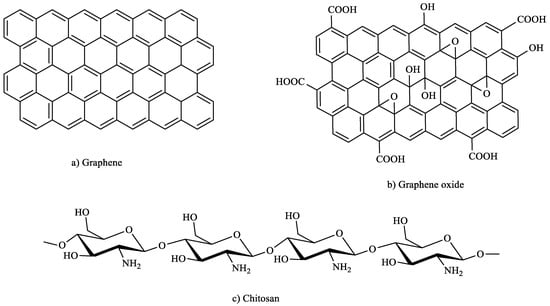 Structures of (a) graphene, (b) graphene oxide, and (c) chitosan.