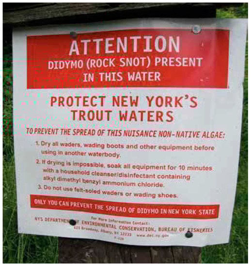 Their structure is considered to be helpful when it comes to metal removal applications due to the large amounts of complex extracellular biopolymers. Due to this characteristic, they are being considered as a fibrous absorbent of lead (II), nickel (II), and cadmium (II) in wastewater systems []. As more research was done on this species of algae, it was found that Didymo would be transferred to different parts of the river by sticking to the bottom of fishermen’s boots. As the fishing industry grew in Vancouver Island, so did the amount of Didymo sightings. It was during this time that a connection was made between fishermen’s boots contaminating more of an area than normal []. It was further discovered that Didymo was not only transferred through fishermen’s boots, but also through people coming to the rivers for recreational activities. Their swimwear and fishing equipment would be used as a vessel for Didymo transference to other parts of the river, as people themselves explored the area. To limit the spread of Didymo, proper signage was made for public awareness. As Figure 3 shows, certain steps needed to be taken by the visitors []. The proper management of sensitive areas can help avoid problems in the future and can help protect the environment.