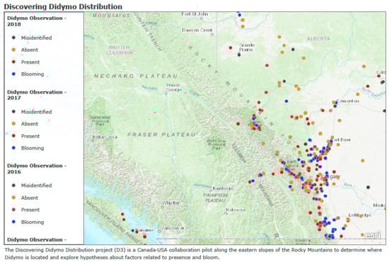 As seen in Figure 4, other areas where Didymo was found and surveryed in Canada were the Eastern Rocky Mountains, specifically, the Athabasca River (surveyed 2003–2007), Bow River (surveyed 2002–2007), and Red Deer River (surveyed 2004–2006) [].
