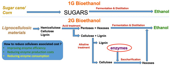 In contrast to that, increased attention has been given to a new promising source of sugars that could also be biologically converted into biofuels or other chemicals [5,6], designated as lignocellulosic materials (LCMs). Lignocellulosic materials are theoretically unlimited, cheaper and may not compete with food crops [7]. However, because of their recalcitrant structure, they also require more complex processes and present more operational constraints (e.g., mass transfer limitations, high viscosities, etc.) that can affect process productivities. A major aspect of converting lignocellulosic materials relates to the need for cellulolytic enzymes (Figure 1), required to convert complex sugars to simpler monomers, which still represents one of the main costs of the process.