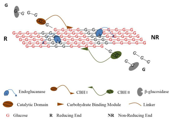 Generally speaking, a cellulolytic organism usually secrets a significant number of cellulases, among which are two classes especially relevant for cellulose hydrolysis: endoglucanases (EGs), which randomly break internal β-1,4-glycosidic bonds, and exoglucanases, such as cellobiohydrolases (CBHs), which act on the reducing/non-reducing ends of cellulose chains. These are complemented by a final class of β-glucosidases, catalyzing the hydrolysis of cellobiose into glucose [19]. In an efficient hydrolysis, these enzymes act synergistically in a concerted action that involves multiple steps: cellulases adsorption onto the substrate, formation of the complex cellulase-substrate, cleavage of the glycosidic bond, displacement of the enzyme over the cellulose chain and cellulases desorption (Figure 3).