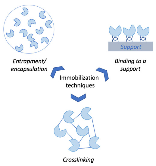 Enzyme immobilization is a procedure widely used in a variety of industrial, medical and analytical processes [63]. The use of immobilized enzymes in any bioprocess leads to an easy handling, separation and reuse of the enzyme. In addition, the storage and operational stability of the enzymes is usually increased, enabling their use in different operation modes such as semi-continuous or continuous operations [64]. Enzyme immobilization can be divided into three main categories: entrapment/encapsulation, cross-linking and binding to a support (Figure 4). Entrapment and encapsulation are low-cost techniques (mainly due to the use of polymers) in which enzymes are either trapped or retained inside a capsule, separated from the reaction medium [65]. Cross-linking enzyme (CLE) technology is a simple carrier-free technique performed with the addition of a cross-linking agent to an enzyme preparation, usually producing a rigid three-dimensional complex of enzymes [66]. Finally, binding to a support is based on the simple attachment of the enzyme to a solid support mediated by different possible chemical interactions (either covalent or non-covalent) [65]. In the particular case of cellulases, immobilization onto a support is one of the most interesting techniques since some strategic advantages can be gained after immobilization, which will be featured below.