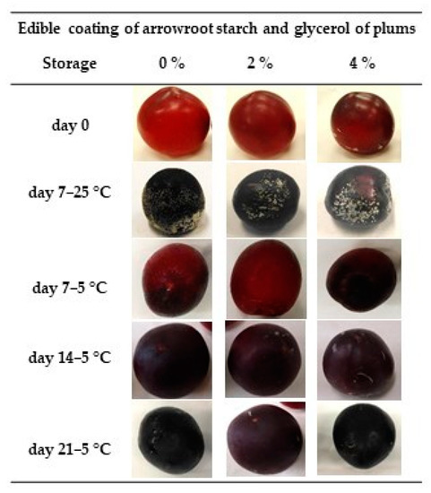 In the evaluation of plums coating, fruits were sanitized with chlorinated water and dried. Coatings were prepared in aqueous solution in the following concentrations: control—distilled water; 2% arrowroot starch (mass/mass) plus 15% glycerol (mass/starch mass); 4% arrowroot starch (mass/mass) plus 15% glycerol (mass in relation to starch mass). The coatings were prepared by dispersing the starch in distilled water. After complete dispersion, the solutions were heated to 85 ± 2 °C in a thermostatic bath (TECNAL, Piracicaba, Brazil), in constant agitation for 5 min, until complete gelatinization [10]. Then, glycerol was added to the starch solution and homogenized. The fruit were completely immersed in the respective solutions for 1 min and then placed on metal wire screens with ventilation incidence, for a period of 12 h, in order to dry the coating. Afterwards, they were packed in polyethylene lid trays, homogeneously with five fruits per pack and stored at 5 and 25 °C for 35 days.