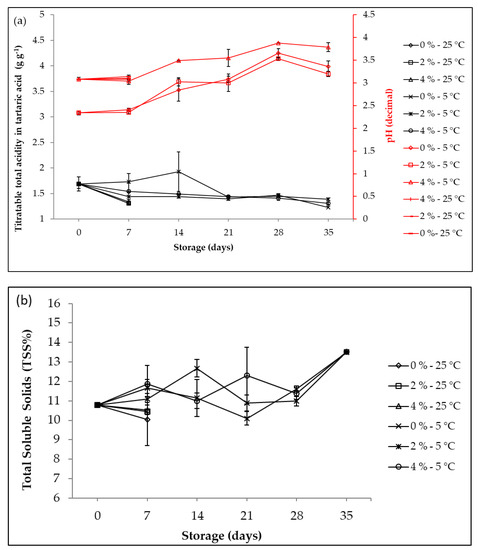 In Figure 4a,b, a significant (p < 0.05) increase in pH and soluble solids and a decrease in titratable total acidity of the plum pulp can be observed at the end of the experiment regarding to day 0, for all treatments regardless of storage temperature. Valero et al. [47], evaluating the effects on four plum cultivars coated with alginate (1% and 3%), for 35 days at 2 °C, reported variations of acidity between cultivars with delayed acidity decrease in the treatment coated with 1% and 3% of alginate, although they did not observed significant differences between these treatments.
