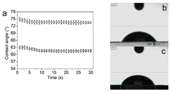 Contact angles of water as a function of contact time (a) for GO (squares) and rGO-g (circles) films; photograph of water droplet on GO (b) and rGO-g (c) films.