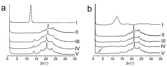 X-ray diffractograms in the 0.9° to 35.0° (2θ) range for (a) GO (trace I), TPS (trace II) and TPS with GO incorporated at 0.5 mass% (trace III), 1.0 mass% (trace IV) and 2.0 mass% (trace V) contents; (b) rGO-g (trace I), TPS (trace II) and TPS with rGO-g incorporated at 0.5 mass% (trace III), 1.0 mass% (trace IV) and 2.0 mass% (trace V) contents.