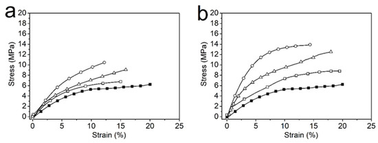 Stress versus strain curves for (a) TPS (closed squares), and TPS with GO incorporated at 0.5 mass% (squares), 1.0 mass% (triangles) and 2.0 mass% (circles) contents; (b) TPS (full squares), TPS with rGO incorporated at 0.5 mass% (squares), 1.0 mass% (triangles) and 2.0 mass% (circles) contents.