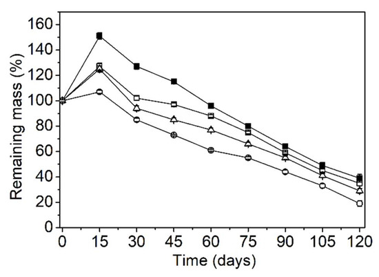 Remaining mass for TPS (closed squares), TPS with GO incorporated at 0.5 mass% (squares), 1.0 mass% (triangles) and 2.0 mass% (circles) during biodegradation in soil for 120 days.