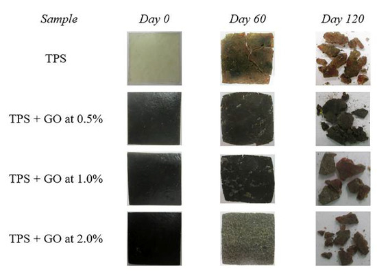 Biodegradation experiments are of fundamental importance for production of environmentally friendly materials. The glycosidic linkages, easily attacked by enzymes of microorganisms, make starch a biodegradable material [22]. For TPS and TPS/GO composites, soil burial tests were carried out at room temperature, and evaluated by weighing specimens regularly (Figure 6). In the first fifteen days, the samples absorbed some soil humidity. TPS absorbed a higher amount of water than the TPS/GO composites. As observed by X-ray diffraction, GO was well-dispersed within starch matrix and the exfoliated sheets acted as a barrier for water permeation in this first stage. For TPS, the primary degradation stage was associated with leaching of glycerol from the starch matrix [39]. Within 45 days of incubation, the TPS/GO composites already show mass loss, which was more pronounced with the increase in GO mass content. As already reported, GO has carboxyl groups linked to the sheet edges. These groups give acid character to GO [40,41]. Furthermore, these acid groups in GO may induce the breakage of glycosidic bonds in starch molecules, accelerate their depolymerization and facilitate the bioassimilation of resulting materials by microorganisms from soil.