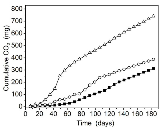 Average cumulative carbon dioxide production from TPS (full squares), TPS incorporated with rGO-g at 1.0 mass% (triangles) and 2.0 mass% (circles) contents for 183 days.