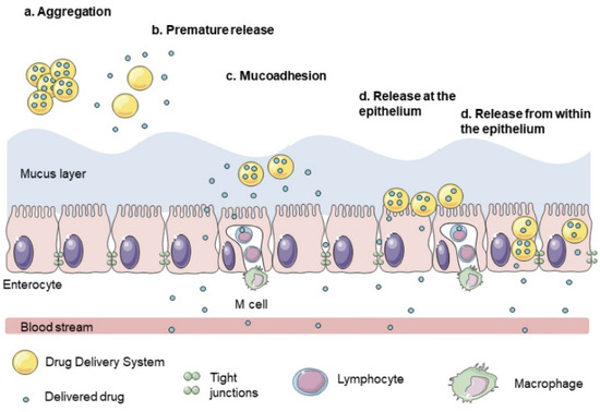 Mucoadhesion is defined as the adhesion between materials (mucosa-material). Formulations designed for mucoadhesive dosing allow prolonged retention at the site, maintaining the controlled release rate of the drug, therefore increasing its bioavailability. Mucoadhesion can be affected by various factors, such as hydrophobicity, molecular weight, cross-linking, swelling, spatial conformation, pH, and polymer concentration. The transit time of these systems depends on the physiological renewal time of the mucus layer. The intestinal mucin turnover time is between 50 and 270 min, so the particles adhere to the mucus for between 4 and 5 h [92]. In the mucus-penetrating mechanism, nanoparticles must avoid adhering to the mucosa. In the design of mucus-penetrating nanoparticles, the particle easily penetrates the luminal mucus layer to break through the underlying adherent mucus layer. Once the nanoparticles penetrate, they are closer to the cells, and a higher dose of the drug is exposed to later bind to the underlying epithelium, improving drug delivery [134].