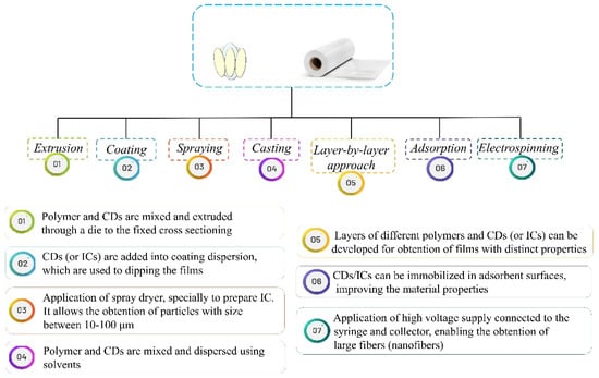 Currently, numerous techniques have been described as strategies for incorporation of CDs/ICs into polymer matrices. They can be directly blended with the polymer matrices for further development of composite films, which is a simple and common method employed for food packaging manufacturing [94]. Along with this, other methods such as extrusion [39,82], casting [12,40], and electrospinning [65,67,72] can be mentioned for application of CDs/ICs into packaging systems, aiming further industrial use. Examples of these techniques and their principles are schematized in Figure 2.